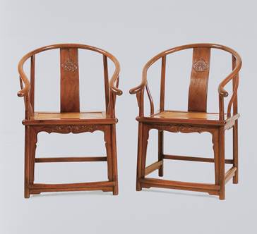 - A Remarkable Pair of Huanghuali Horseshoe Armchairs, Late 16th to Early 17th Century (Estimate: HK$1,800,000 – 3,000,000; pictured left)