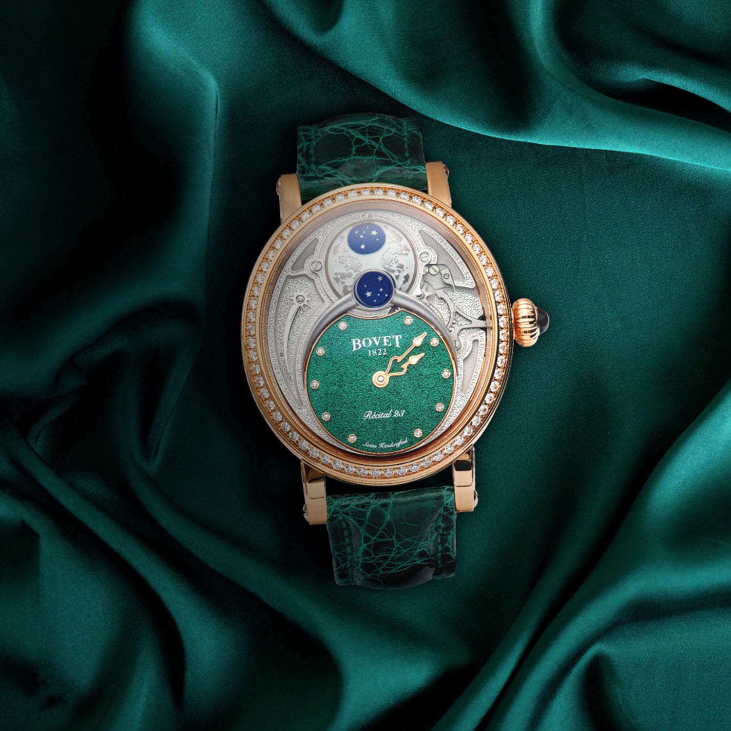 ปีนี้ Récital 23 ได้รับการตกแต่งด้วยสีและวัสดุพิเศษสองแบบ หน้าปัดที่มีความสวยงามนี้ได้รับการแกะสลักและเคลือบแลคเกอร์เป็นชั้นๆ มีลักษณะเฉพาะตัวที่สื่อถึงคำมั่นสัญญาของต้นไม้เขียวขจี ท้องทะเลอันเงียบสงบ เป็นวันที่มีแสงแดด และคืนเทศกาลที่แสนอบอุ่น