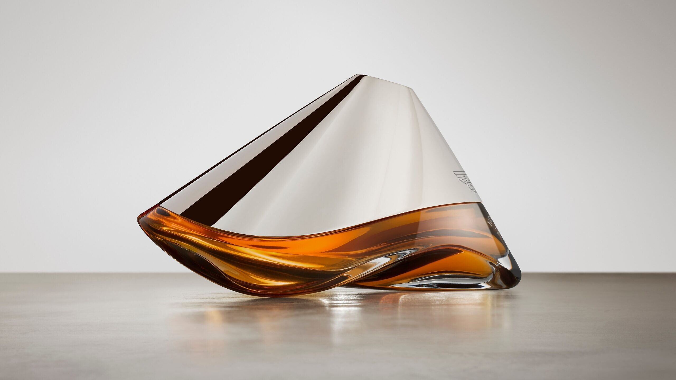 Each handblown decanter takes inspiration from the F1-inspired aerodynamic exterior of the Aston Martin Valkyrie hypercar, including the full-length venturi tunnels that contribute to in the region of 1,100 kg of downforce, and the natural fluid forms of the terroir of Islay. Emanating from the design direction and principles of an Aston Martin, Bowmore ARC-54 is sculpted with precision, creating a striking sense of flow in its lines and styling. The shape is defined by these fluid aerodynamics and showcase the shared philosophy through the diffuser inspired glass sculpture to enhance the flowing reflections of the whisky within.