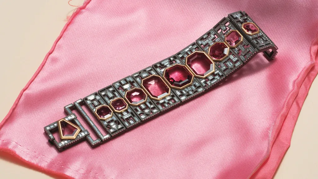 Set with 10 octagonal-cut antique Afghan (Tajikistan) spinels dating to the 19th century, this bracelet is a prime example of Santi designer Krishna Choudhary’s exceptional access to historic stones. Based in Jaipur for 10 generations, his family has sourced gems for India’s maharajas and nobility for centuries. Now, the 36-year-old Choudhary—who studied art before becoming a jeweler—has forged his own path by setting antique gems in modern geometric designs. Because of its complexity, this articulated open-worked titanium bracelet, featuring an intricate lattice of custom-cut baguette diamonds, took three years to complete. It was worth the wait.