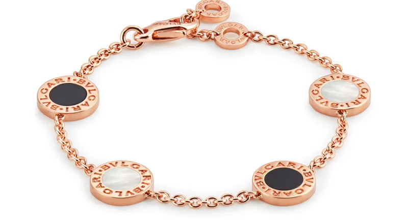 Sometimes, the best accessory is one that accessorizes your watch. Wearing a gold bracelet with a gold watch has long been a style statement, one that distinguishes an elegant woman’s timepiece from its more utilitarian tool-watch counterparts. This Bulgari Bulgari chain bracelet in 18k rose gold is designed with mother-of-pearl and onyx on round disks that echo the shape of a classic round dress watch.