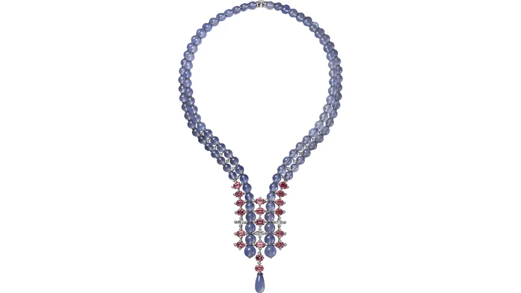 For a heritage house like Cartier, it’s easy to revisit its illustrious archives for inspiration. The challenge is evolving its design in contemporary ways. Mission accomplished: The Nature Sauvage high-jewelry collection reveals a progression of the French brand’s iconic motifs and designs in colorful, playful styles. There’s a feeling of movement in curvaceous shapes that sweep up the ear or drape around the neck like a supple silk scarf. What stands out is an enduring sense of modernity. Cartier’s use of beaded stones dates back to the maison’s early 20th-century designs and continues to look fresh today in such pieces as a necklace named Le Voyage Recommencé. Composed of a fluid pattern of chalcedony, spinel, and diamonds set in platinum, it hits just the right balance of color, texture, and form