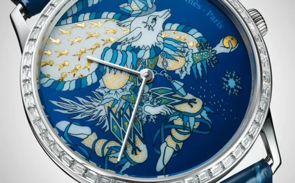 This wintery dial depicts an ice wolf in paillonné enamel against a gorgeous deep blue background. From the...