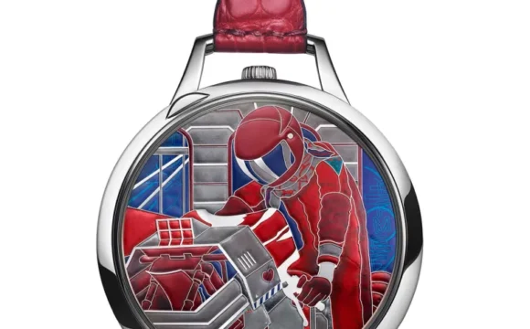 ผู้ขับขี่ในดีไซน์นี้ไม่ใช่นักขี่ม้า แต่เป็นนักขี่มอเตอร์ไซค์สวมหมวกกันน็อค ซึ่งแน่นอนว่าเป็นครั้งแรกสำหรับฝาครอบนาฬิกาพกที่เคลือบเอมัลล์ ฝาครอบ champlevé อิงจากดีไซน์ผ้าพันคอที่สร้างโดย Viktor Hachmang นักวาดภาพประกอบและนักออกแบบชาวดัตช์ ซึ่งกราฟิกแห่งอนาคตนี้ได้รับอิทธิพลจากศิลปะญี่ปุ่นและวัฒนธรรมป๊อปของหนังสือการ์ตูน พื้นหลังคือหน้าร้าน Hermès ประวัติศาสตร์ที่ 24 Faubourg Saint-Honoré...
