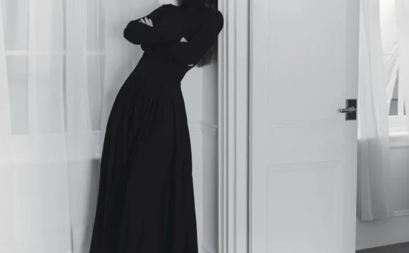 ชุดเดรส Lisette จากแบรนด์ Khaite ผลิตจากผ้าขนสัตว์เมริโนเนื้อละเอียดสีดำ ราคา 5,400 ดอลลาร์ รองเท้าบูทหนังสีเทาอ่อนสูงถึงเข่าจากแบรนด์ Willow ราคา 2,500 ดอลลาร์ ต่างหู Sunlight จาก...