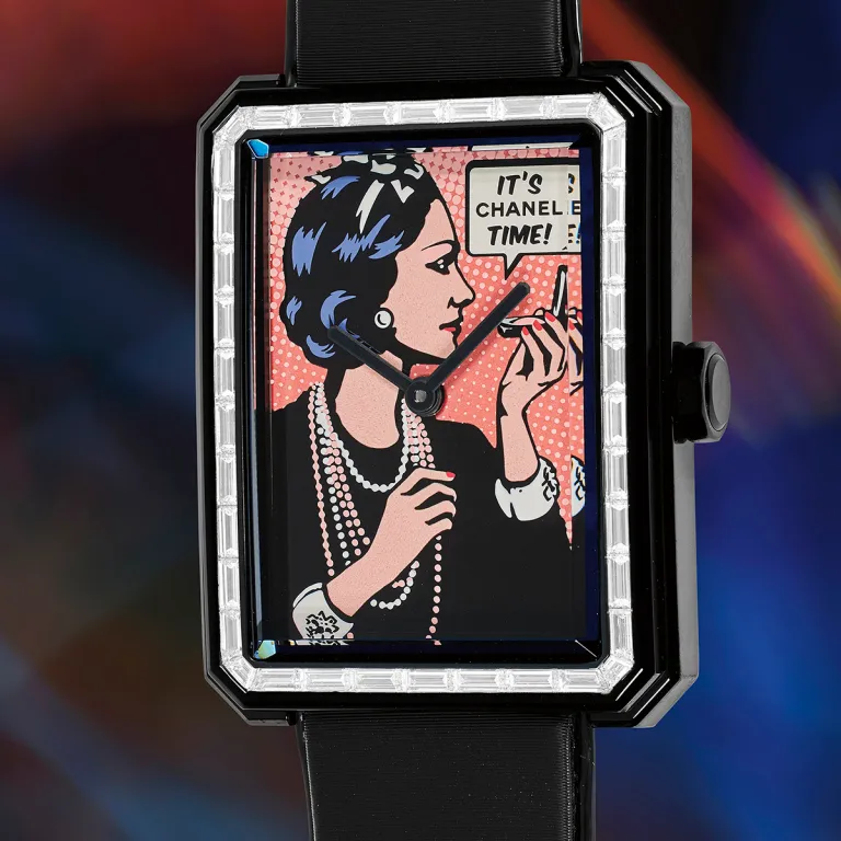 นาฬิกา Chanel Boy-Friend ที่ไม่เหมือนใครนี้ เป็นส่วนหนึ่งของการขาย TimeForArt ด้วยเคสสแตนเลสสตีลสีดำที่ไม่เหมือนใคร มันเป็นตัวอย่างที่ดีเยี่ยมของอิทธิพลที่เพิ่มขึ้นของวัฒนธรรมป๊อปและป๊อปอาร์ตบนนาฬิกา หน้าปัดนี้มีภาพประกอบของผู้ก่อตั้งแบรนด์ Gabrielle Chanel วาดด้วยเคลือบเอมัลล์ grand feu พร้อมสายสร้อยไข่มุก แขนเสื้อแบบคัฟ และลิปสติกสีแดง ขับเคลื่อนด้วยกลไกไขลาน