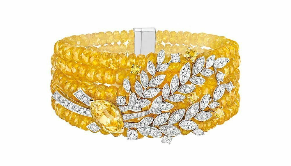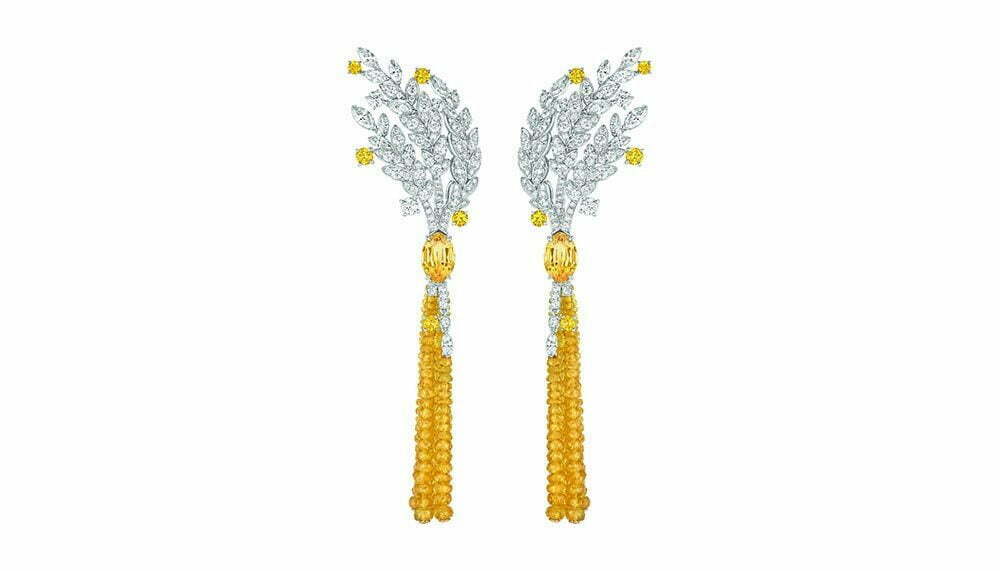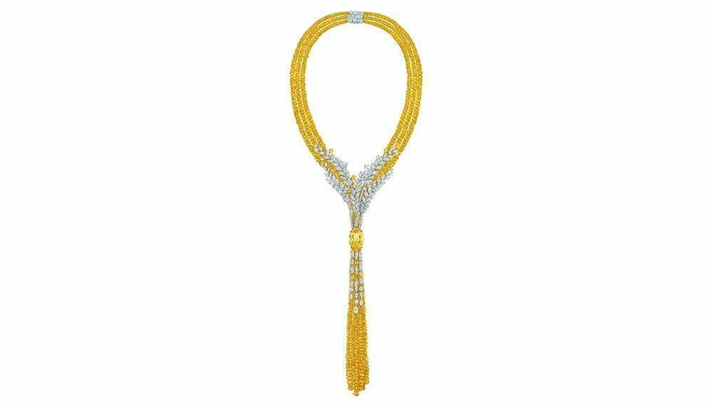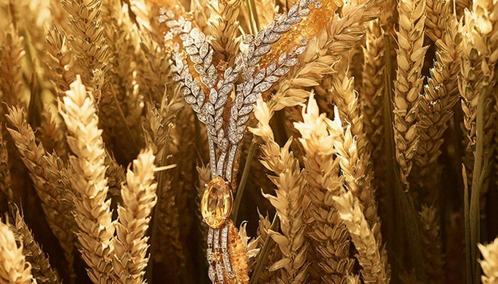 The 62-piece haute joaillerie collection consists of one-of-a-kind diamond and gemstone earrings, necklaces, rings, watches and bracelets, each of which gracefully incorporate subtle and overt images of the grain in gold, diamond and gemstones. The collection is divided into several ‘seasons’: Fête des Moissons (Harvest Festival) showcases the wheat at its richest and ripest in diamonds against gold, in tribute of good harvests to come, including the astounding Moisson d’Or necklace in 18-carat white and yellow gold with a 16.8-carat yellow sapphire, diamonds, yellow sapphires and yellow sapphire bead.