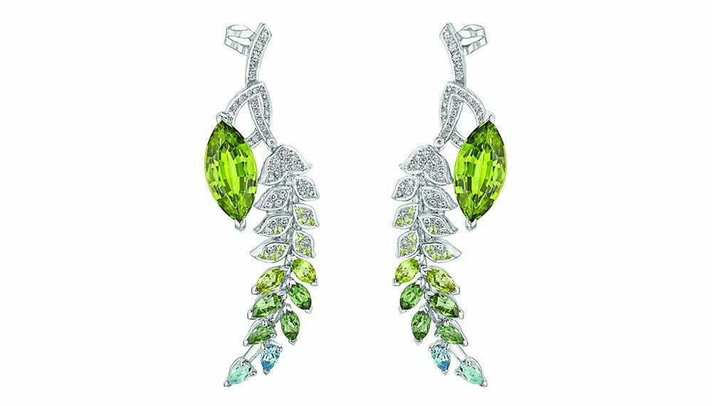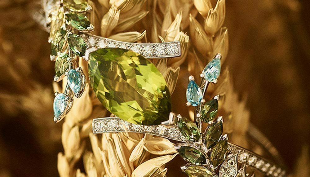 Épi d’Été (Husk of Summer) zooms in on the form of the marquise-cut grain itself, using the seed as a canvas for stunning jewellery, like the L’Épi brooch n platinum and 18-carat yellow gold set with baguette-cut, marquise-cut and brilliant-cut diamonds, coloured stones and coloured paving, bursting with sunshowers of gold and colours. Brins de Printemps (Stalks of Spring) is the wheat as a tender young shoot in iridescent shades of green, particularly radiant in the Brins de Printemps ring in18-carat white gold with peridot, diamond, aquamarine and tourmaline.