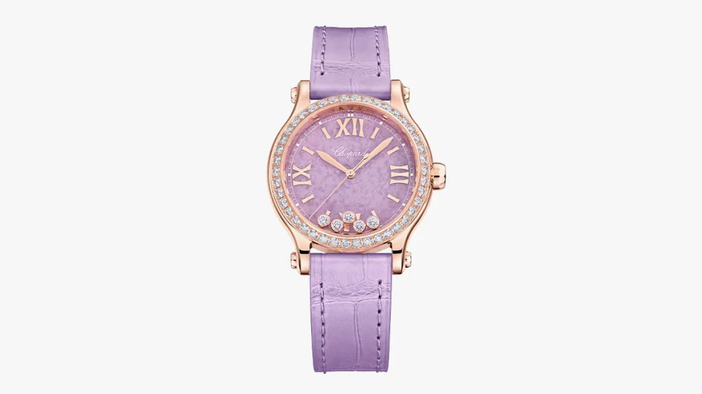 Chopard, a purveyor of both watches and jewelry, is ideally positioned to uncover rare gems and minerals for use in its watch dials. The new Happy Sport’s dial is made of lepidolite, a lilac-colored hardstone with a sparkly matrix and swirling pinkish undertones. It’s the first time a hardstone has been used in the collection, and it has a true feminine hue. The color, which represents serenity and calm, is framed in a rose-gold case, with a lilac strap and a purple amethyst in the crown. Like all Happy Sport models, the lepidolite is topped by five diamonds that bounce between two crystals over the dial. The watch contains a scaled-down automatic movement, the caliber 09.01-C, which Chopard developed to fit the dimensions of the Happy Sport case—this one is 33 mm. This is a 25-piece limited edition.