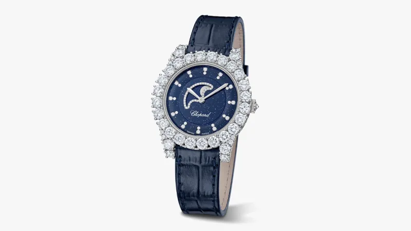 A high jewelry moon phase watch is one of the most impressive expressions of ladies watchmaking mixing a poetic complication with sizeable diamonds. Chopard brings 3.86 carats of dazzle to this one, with double diamond markers, a ring of diamonds around the moon phase display, and a bezel set with large diamonds that extend to the lugs.