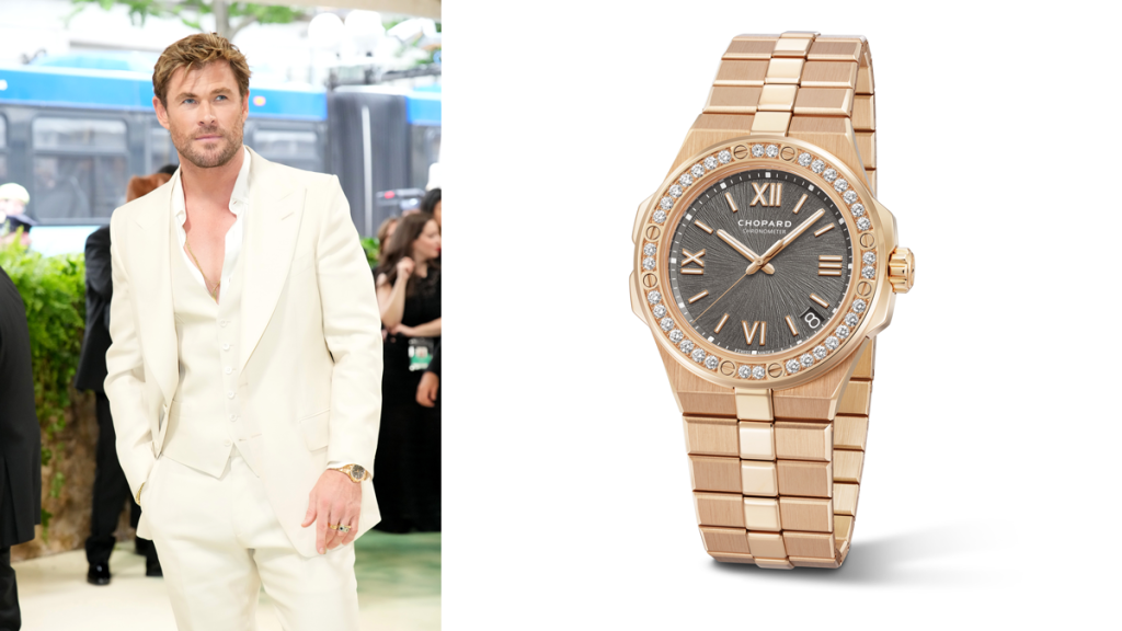 Chris Hemsworth, known for portraying Thor, showcased a Grecian god-inspired look at the Met Gala alongside his wife, Elsa Pataky. Opting for a softer aesthetic, he donned monochromatic neutrals, complemented by Chopard’s Alpine Eagle watch in rose gold with a diamond bezel. While he’s previously flaunted bold timepieces like the Bulgari Octo Finissimo Skeleton and AP Royal Oak, his choice of a refined and elegant watch for the Met Gala aligns well with the event’s nature and time-inspired theme.