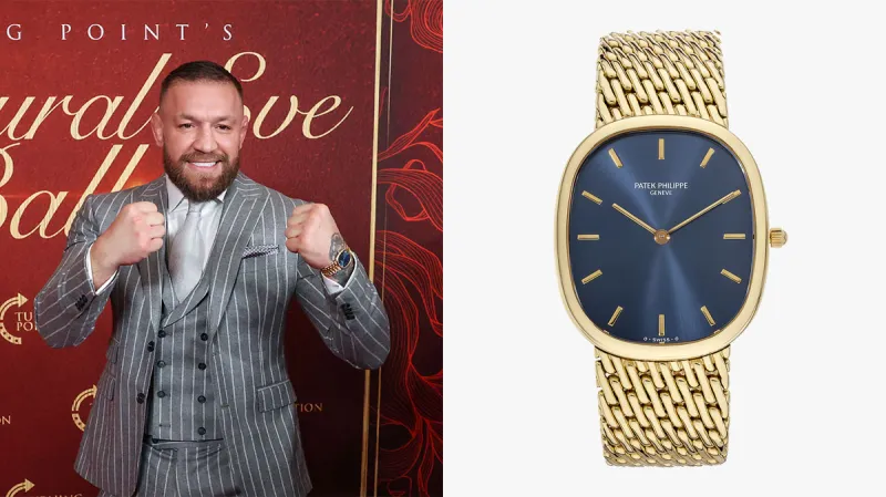 Irish professional mixed martial artist and boxer Conor McGregor was spotted this week wearing a vintage Patek Philippe Ellipse in yellow gold, Ref. 3738/118. McGregor rose to global fame as a UFC fighter, becoming the first UFC champion to simultaneously hold titles in both the Featherweight and Lightweight classes. In addition to his love of fighting, he also has a passion for watches and owns several Patek Philippe models, including two Nautilus chronographs, two Annual Calendar Chronographs, a Calatrava Skeleton, and a Rare Handcrafts Calatrava. Photographed here is Patek Philippe’s latest Ellipse which retails for $38,060. If you prefer McGregor’s yellow-gold version with the blue dial, you can expect to pay around $30,000 on the secondary market.