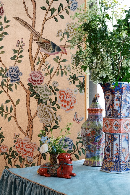 Explore a series of hand-painted porcelain designs, including decorative vases transformed into electrified lamps paired with slub silk lampshades, as well as charming figurines and tea sets—all meticulously crafted using centuries-old techniques. The pop-up also showcases two folding screens crafted from 12 Carat White Gold gilded silk, with their design, ‘Earlham’ drawing inspiration from mid-18th century panels housed in the Victoria & Albert Museum. Embodying the essence of slow luxury, the silk wallpapers can be rebacked and reinstalled multiple times, ensuring longevity and sustainability.
