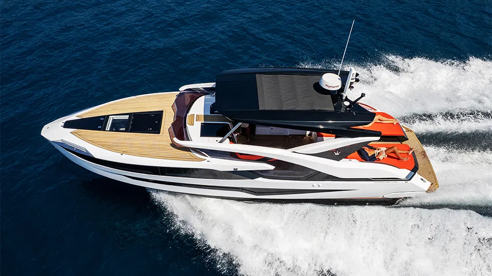 British poet Lord Byron famously declared Montenegro’s fjord-like Bay of Kotor to be the world’s “most beautiful encounter between land and the sea" an idyllic (and ideal) testing ground for Dominator’s new $1.3 million Midi Ilumen M35, which the Italian yard designed as a petite doppelgänger for a client’s 90-foot Ilumen 28M. Its billing as a 35-foot “mini- superyacht" sounds pretentious, but the details demonstrate a yacht-like quality: hand-laid teak decks with splashes of mirror- polished stainless steel and a chic reverse-angle windshield.