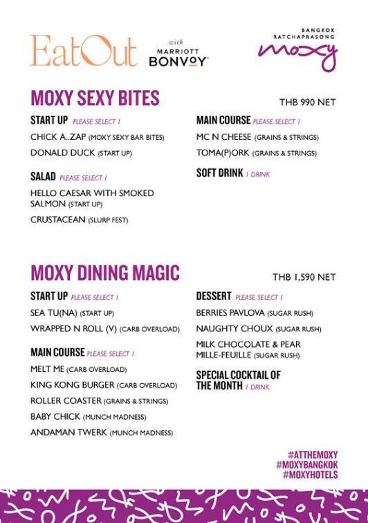 For a more elevated dining experience, the THB 1,590 net set, Moxy Dining Magic, offers a full culinary journey designed to savor and sip in true Moxy style. Guests can kick things off with flavorful starters like Sea Tu(na) or the vegetarian-friendly Wrapped n Roll (V), followed by a choice of hearty mains including Melt Me, King Kong Burger, Roller Coaster, Baby Chick, or Andaman Twerk. For dessert, choose from sweet endings such as Berries Pavlova, Naughty Choux, Milk Chocolate & Pear Mille-Feuille, or the Thai-favorite Mango Sticky Rice. The experience is topped off with Moxy’s Cocktail of the Month, adding a spirited twist to an already bold and fun dining moment. To explore more about these two Eat Out with Marriott Bonvoy offers, visit https://www.marriott.com/offers/eat-out-with-marriott-bonvoy-at-moxy-off-168152/bkkox-moxy-bangkok-ratchaprasong?propertycode=bkkox