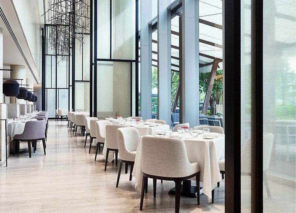 Embassy Room, located on the 9th floor of this stunning new landmark hotel, serves breakfast, lunch and dinner in Western- Asian inspired culinary style and seafood is a specialty. The restaurant has a modern and sophisticated design with an open kitchen, providing an entertaining atmosphere and appealing to those who enjoy watching culinary drama. In addition to the main dining room, the restaurant also has a private dining room and an outdoor seating area overlooking the garden and the infinity pool.