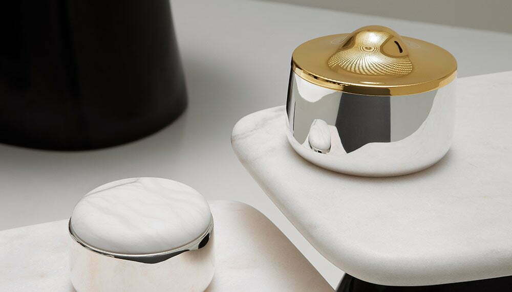 The bowl is actually a double box. The marble cover can be removed to reveal the first box, and for the second, the silver-plated curved top can be lifted to separate it from the bowl. Adding to the collection are small votive candles in silver or brass candleholders at €120 each. In addition to being signed, each limited-edition piece is also numbered and comes with a certificate of authenticity.