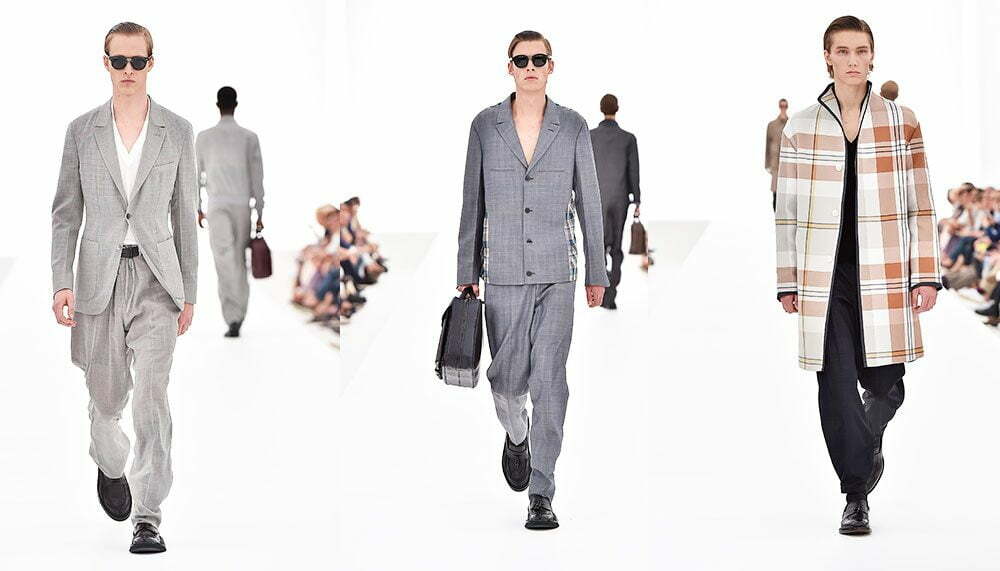 On a stark white runway in Milan, Pilati sent the first eight male models out dressed in black. The designer’s skill with cut and fabric was in full effect as the different silhouettes went down the catwalk. There was nothing to distract from the gentle taper of the suit jackets, nor the full billow of the belted coat. Textures also sang, with each fabric in a subtly different note, coming together in a harmonious blend. The last of the eight looks, a double-breasted suit, was made with a transparent light wool georgette that revealed an internal construction of madras checks, which led neatly into the next look.