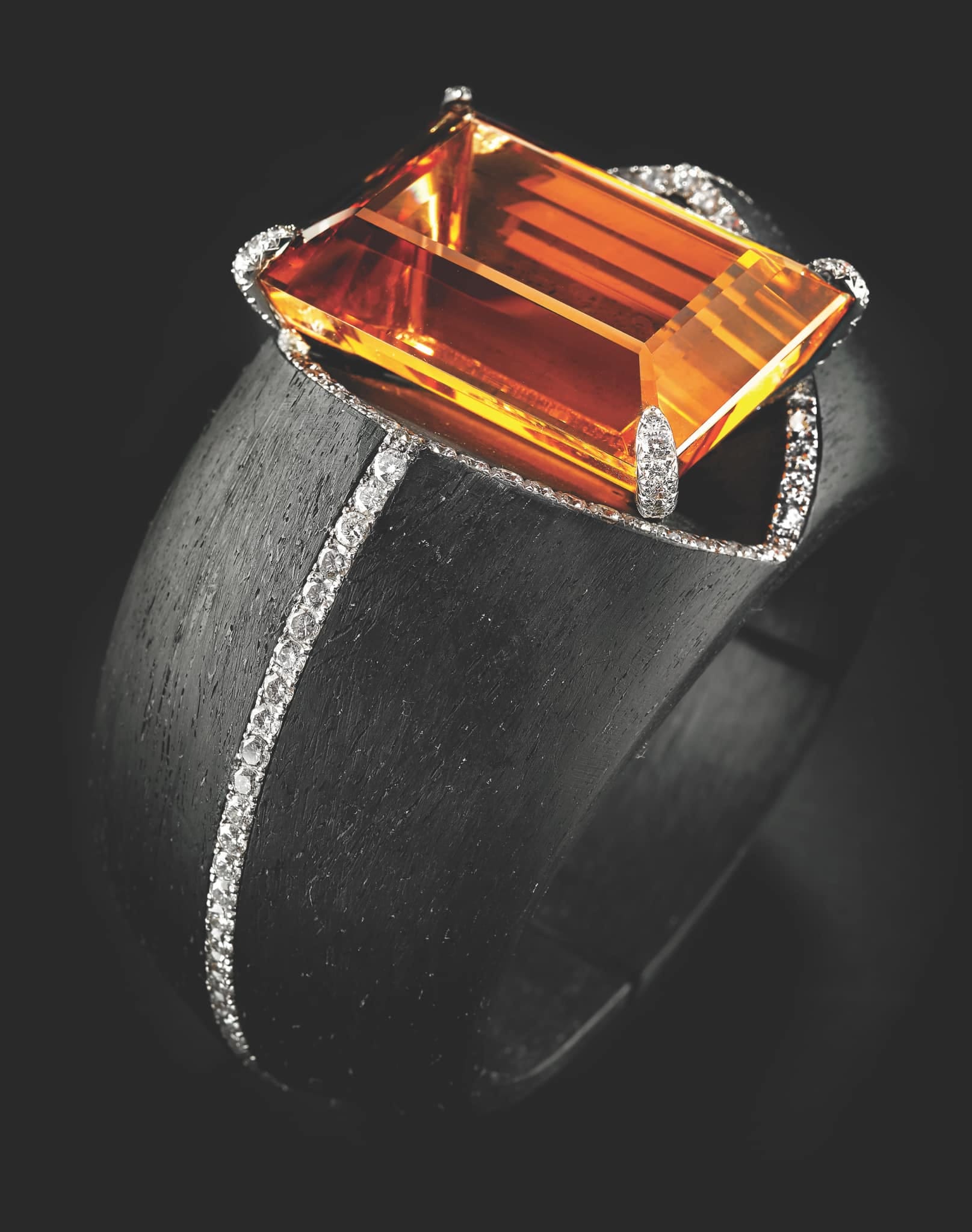 Tired of the classic jewelry codes, Rome-based designer Fabio Salini turned to sleek carbon fiber for its lightness, durability and striking contrast with precious gemstones and gold. “Carbon fiber brings jewelry into a contemporary, even futuristic dimension," he says. The industrial material’s silky-yet-rough finish provides the perfect setting for this enormous 120-carat citrine, which is cradled in a carbon- fiber cuff with 7.6 carats of diamonds. Despite its outsize proportions, the bracelet is remarkably lightweight and unpretentious.
