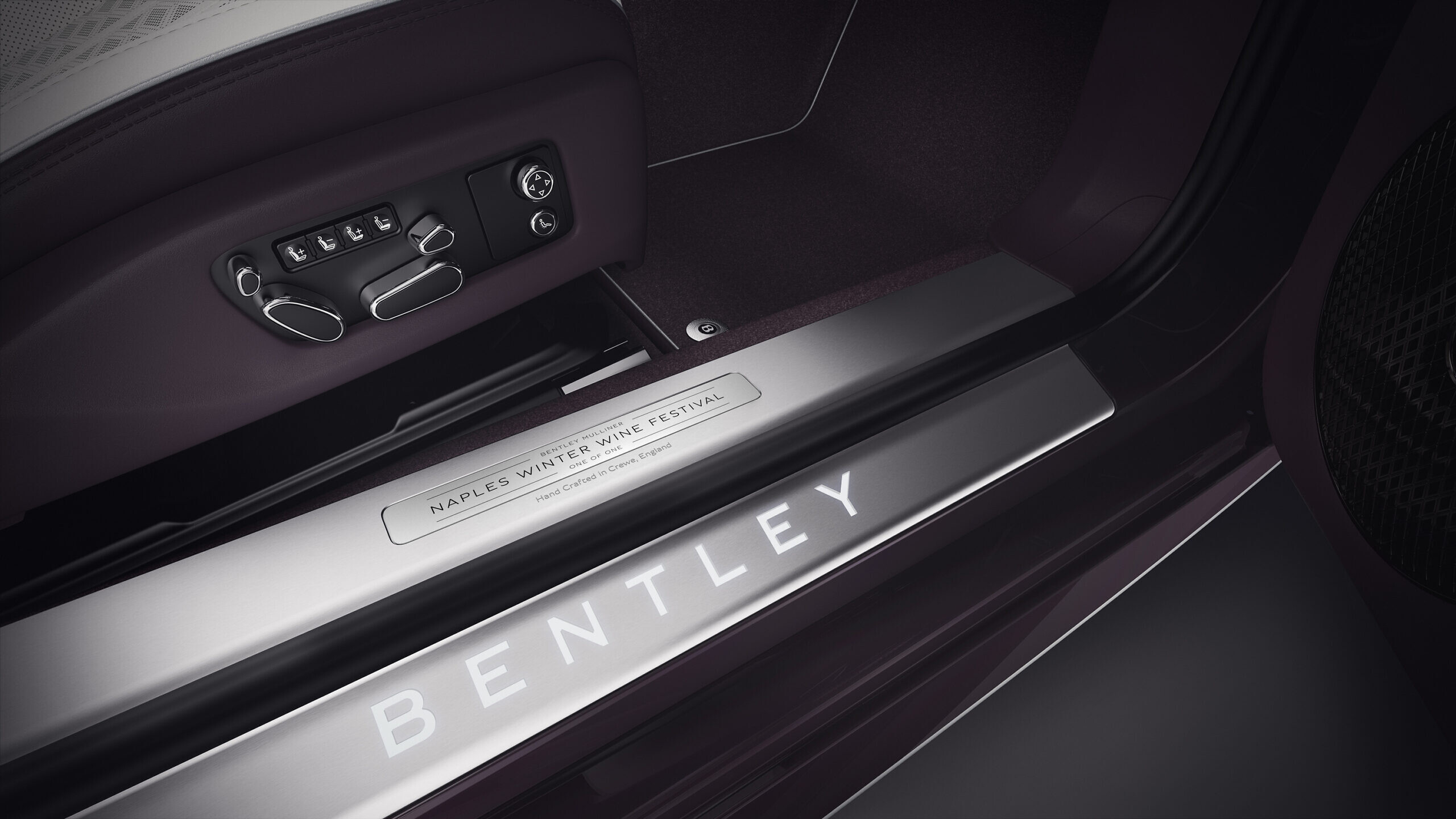 The GTC features a striking Damson exterior paint paired with a Dark Grey Metallic fabric roof, while the Light Grey interior roof complements the White main hide and Damson secondary hide, accented with silver seat piping. Adding to its exclusivity are personalized Naples Winter Wine Festival treadplates, blackline and touring specifications, LED welcome lights, and a Moonbeam-painted pinstripe around the exterior. The GTC also features a unique piano white and Damson-painted veneer, a specification exclusive to Mulliner, making this vehicle truly one of a kind.