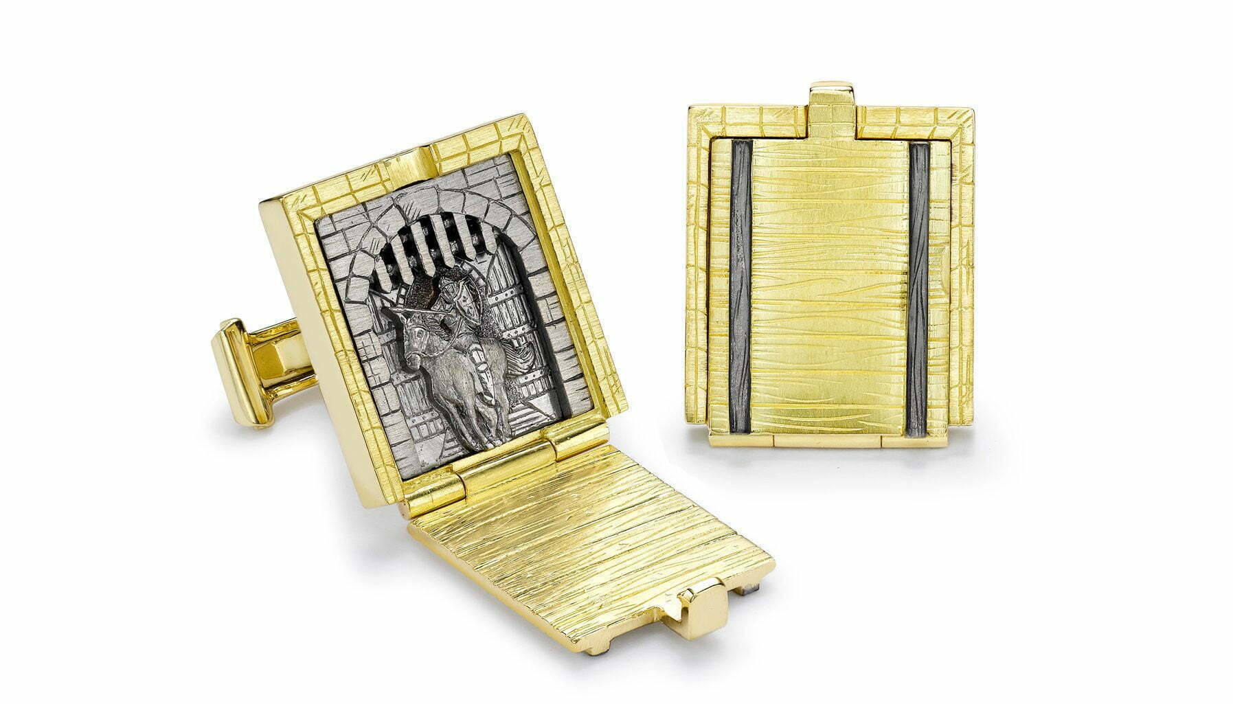 Founded after its namesake, Theo Fennell was obsessed with the nitty gritty, and his passion for details soon led him to design some of the most intricate cufflinks. At a slight flick, the 18ct Yellow Gold Drawbridge cufflinks open to reveal a three-dimensional engraving of a chivalrous knight on horseback charging through castle gates in 18k white gold. A bespoke service offered by the brand allows customers to personalise their cufflinks with a scene of their own.