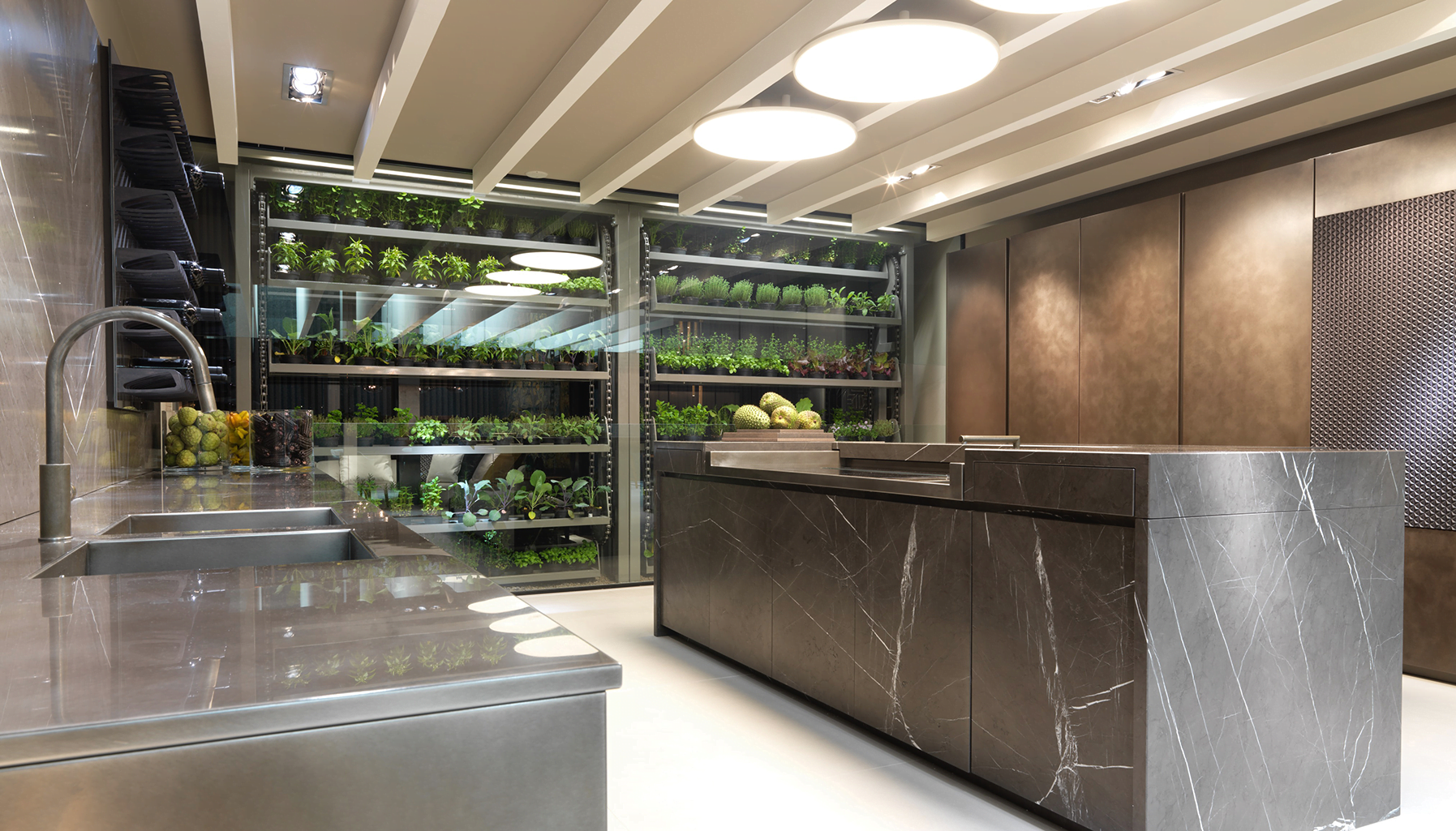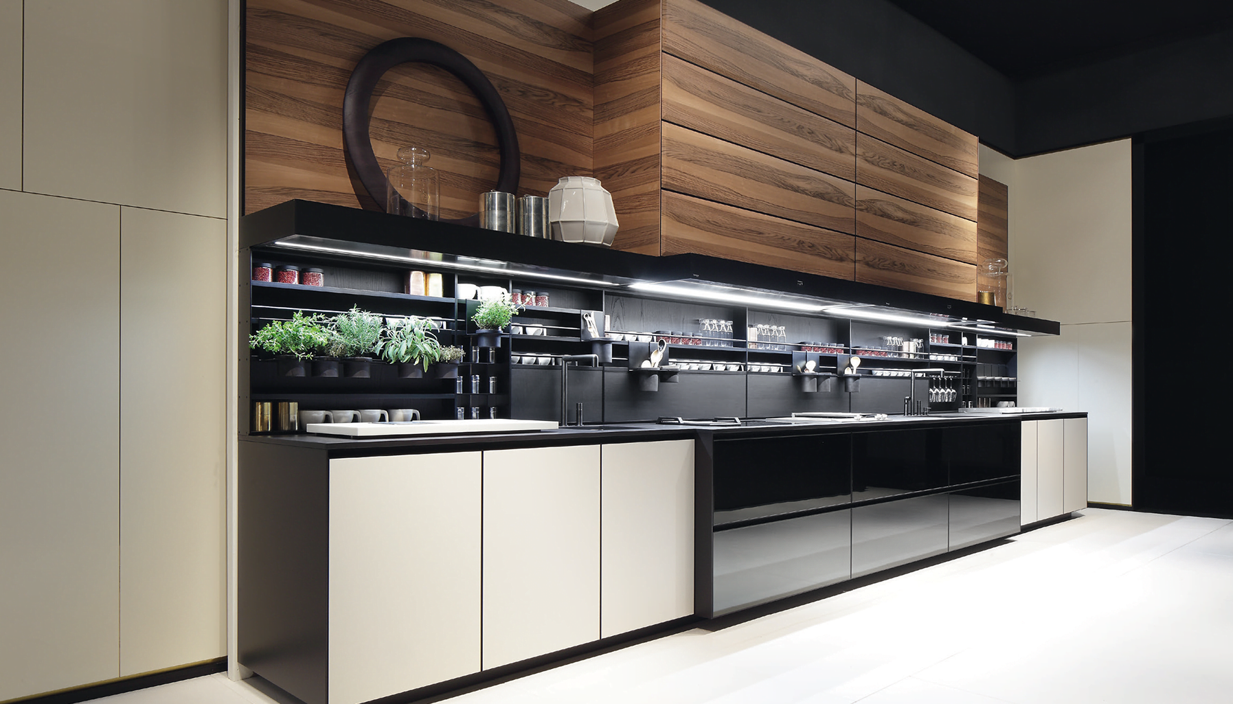 It’s practically a given that the experts at Poliform can create kitchen designs that are sleek and functional. Arthena in the Varenna collection keeps things ultra-streamlined by doing away with handles and using a special processing of the edges framing the door panels. The effect is sleek but not clinical – Caneletto walnut and black elm imbue it with a touch of warmth, partnered in high style by new materials such as bronzed black liquid metal, chamfered Fossena stone blaze and moka anodised doors and fume reflecting glass. But it’s the brand’s homage to the farm-to-table concept that turns heads. The system’s integrated herb racks let you grow an assortment of herbs and miniature vegetables right in your kitchen, while the addition of white LED lighting gives even black thumbs a valuable headstart.
