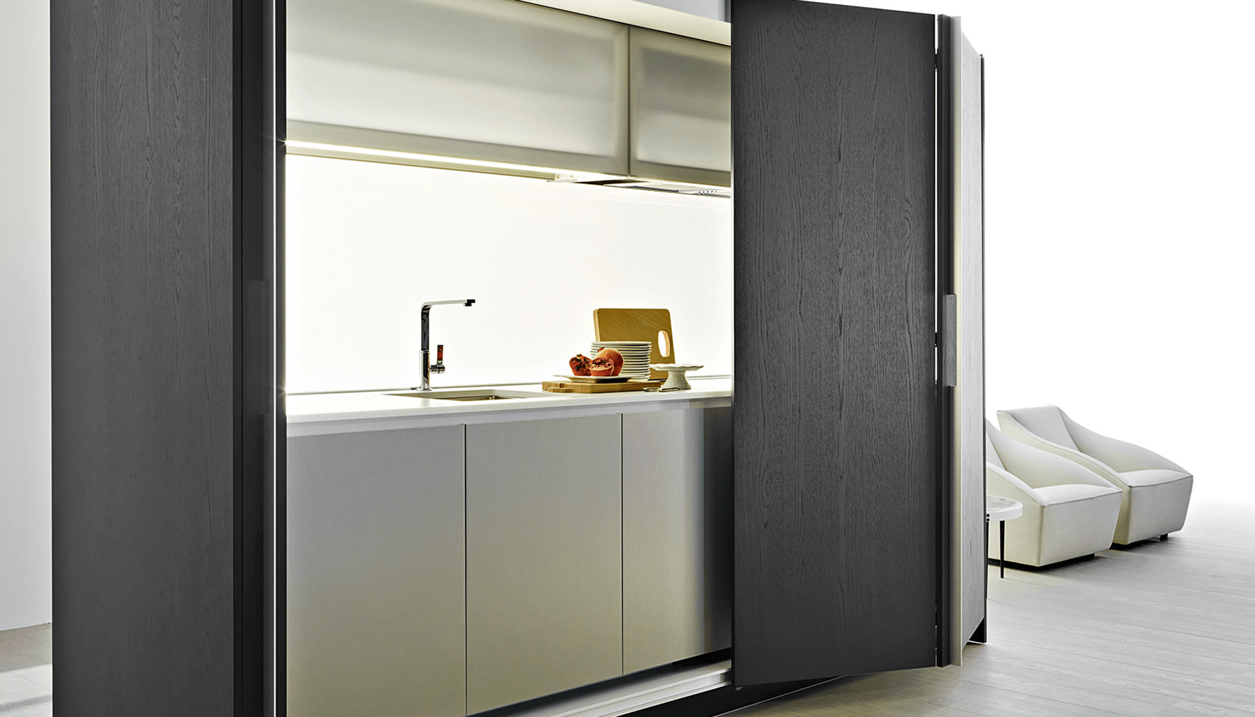 An updated version of the 2004 model designed by Dante Bonuccelli, Tivali has changed from a linear to a corner solution. While its basic elements remain, it now offers large folding doors that glide into the side compartments with a light, fluid touch, thanks to a mechanism designed in the 1990s by Luca Meda and patented by Dada. Once you’re done with cooking, simply fold your kitchen away by closing the smooth gliding large doors.