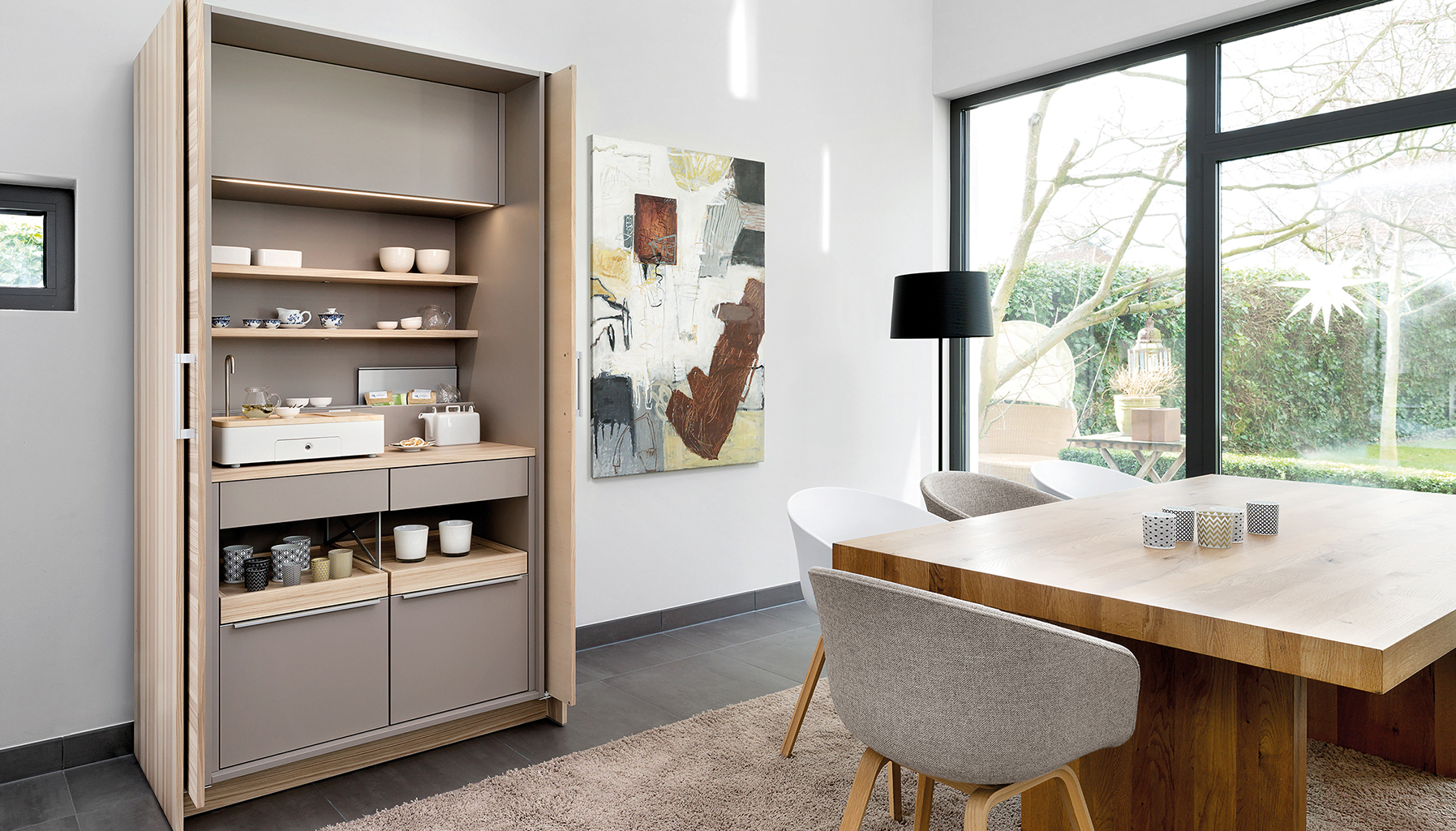 The German kitchen manufacturer has come up with +Stage – a unique and compact solution that is just 120cm wide. Its ingenious design offers slide-in hinged doors called pocket doors that tuck into a 64.5cm depth. The doors can blend harmoniously into a tall unit line or be opened up to showcase their contents as a visually striking standalone unit. Create a bar or a functional kitchenette, put it in your bedroom, living room or office – it’s really up to you to set the scene. And with the myriad of finishes and front colours available, personalisation is assured.