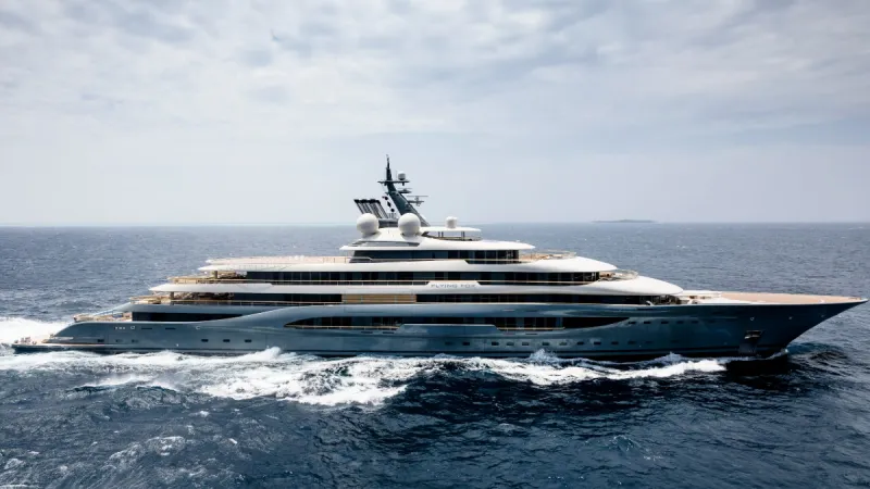 Once chartered by Beyoncé and Jay-Z, the 446.2-foot Flying Fox is arguably the most high-profile yacht on this list. It remains the largest yacht available for charter—and the most expensive with a weekly rate of around $4.4 million. It returned to the charter market in 2024 after several years on the Russian sanctions list. Key features of the Espen Øino–designed exterior are a curvaceous dove-gray hull and a 40-foot swimming pool that runs athwartship on the main aft deck, the largest ever found on board a yacht. There’s also a dive center, a decompression chamber, and two helipads.