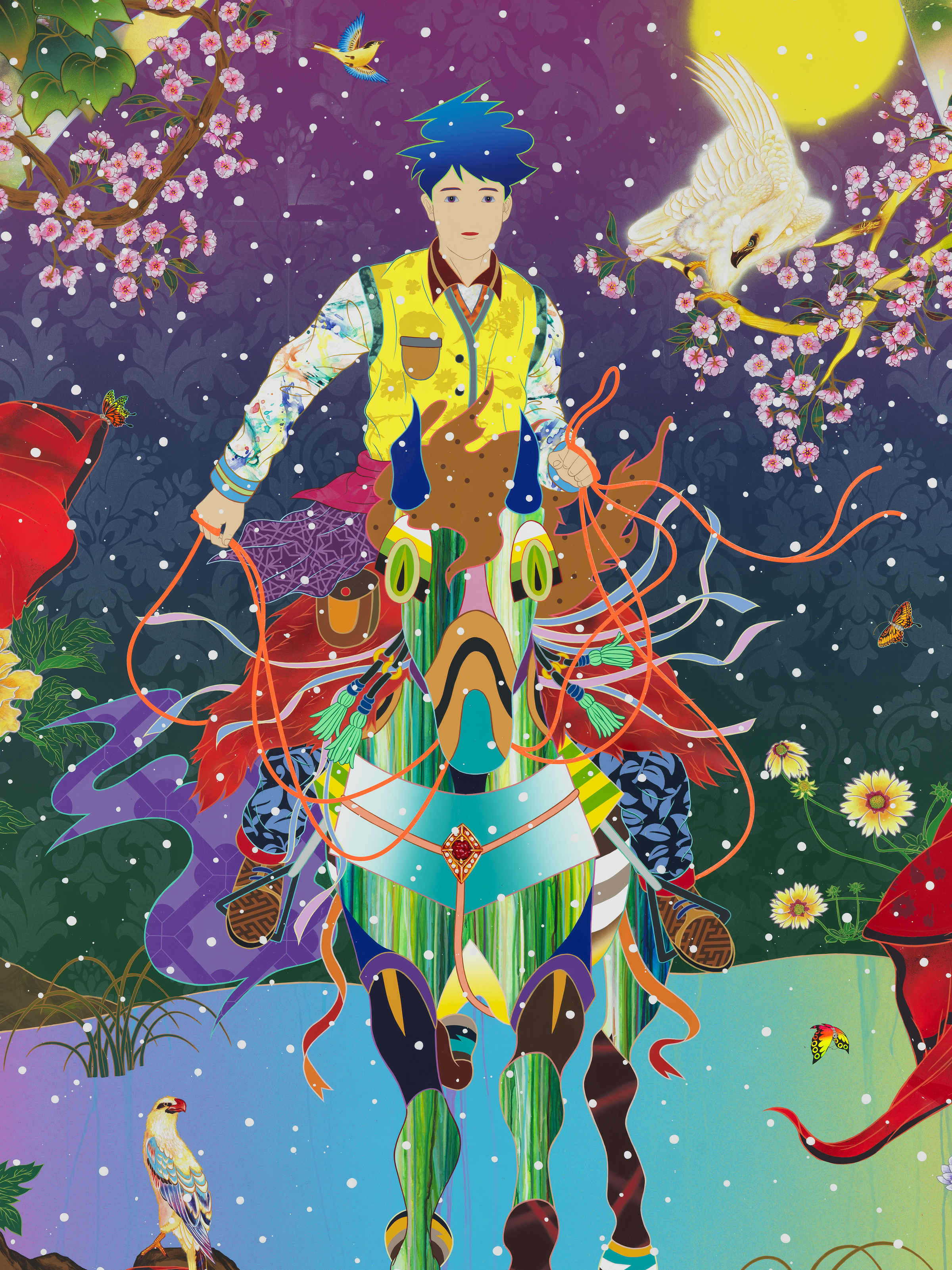 Unique in flavour and aesthetic, each piece of the afternoon tea will be embellished with intricate, symbolistic imagery drawn from works of the ‘FIRST LAST’ exhibition. The first and third tiers take inspiration from works such as Passage Immortalitas, while the second tier incorporates elements of his abstract painting Keep Fishin’ For Twilight, which evokes the imagery of a thousand origami cranes.