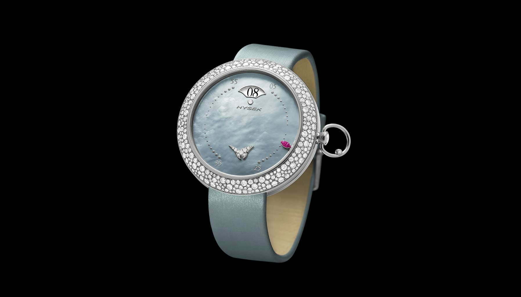 Available in five versions, all in pastel hues, glittering with gems or shimmering with mother-of-pearl on the dial, the collection is overtly feminine. Within the automatic versions, the movement has all the touches of a Hysek creation. A three hand is, no doubt, too basic for Hysek, which is why the HW61 movement gives the timepiece a jumping hour, visible through an aperture at 12 o’clock. The minutes are marked by a marquise-cut spinel that moves around the dial.