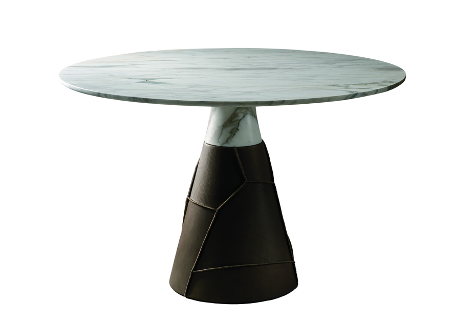 Designed for furniture brand Morfosi by Giorgio Bonaguro, who splits his time between Brazil and Italy, the Sertão table is a tribute to northeastern Brazil and its heritage of leather craftsmanship. The marble top sits on a conical wooden base covered with various cuts of hand-sewn leather that create uniquely irregular patterns.
