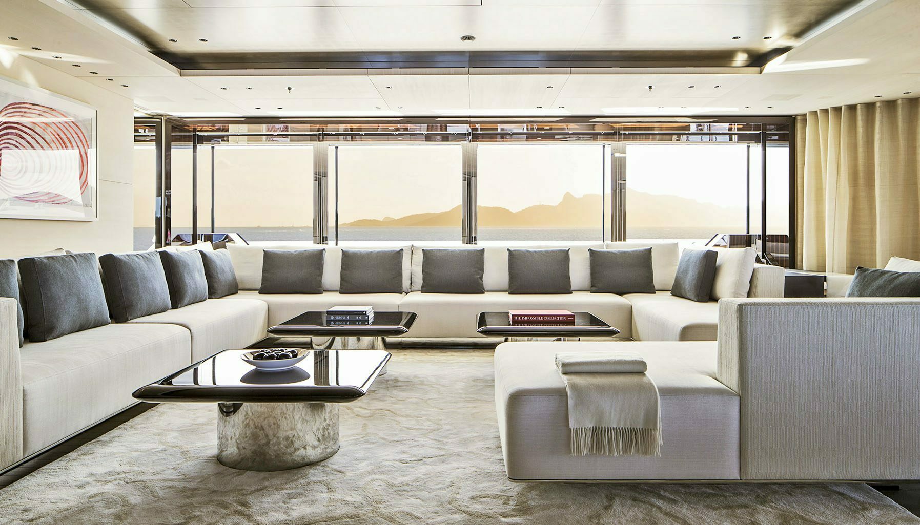 The most striking feature of fully customised superyacht Perini Navi’s Grace E is its sundeck, designed as a health spa at the request of the owners; they wanted the 73-m trideck super yacht to be a spa at sea. Designer Phillippe Briand accommodated that request by outfitting the 232-sqm space with a hydro therapy room that includes a cold plunge pool, a meditation room that features a 180-degree view of the sea, and a massage area that is connected to a hammam-style steam room. The deck’s outdoor area features six sun pads, a hot tub, and shaded seating pods. A remarkably quiet diesel-electric power plant provides a measure of tranquility on the high seas; the noise level in the saloon reaches just 45.5 decibels, which is about as loud as it is in a library, even as the propulsion system is propelling the yacht at 14 knots.