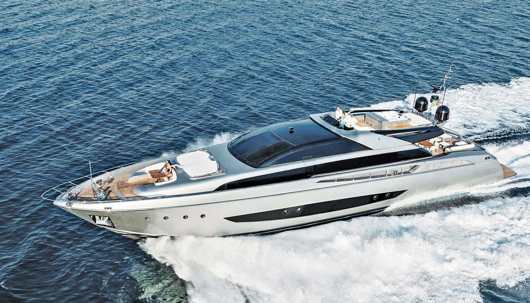 Lightweight aluminum construction enables the Riva 122 Mythos, the latest and largest model in the Riva range, to reach a top speed of 27 knots and cruise at 25 knots. The first model features a three-cabin layout; the standard Mythos layout, however, includes four cabins and the option to add a fifth. The yacht’s saloon is furnished with three white-leather sofas and a 55-inch TV that drops down from the ceiling. The master stateroom features natural-wood furniture and chrome-plated accents. A large Jacuzzi, a sun pad, and a bar are on the upper deck. At the stern, a hydraulic platform allows for easy diving into the sea and can be used to launch the 16-ft tender or personal watercraft stored in the garage.