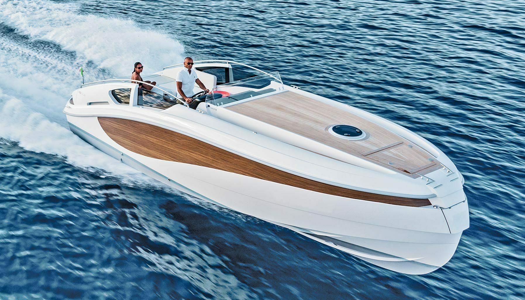 In designing a tender for its 46m model, Italy’s Wider created an exquisite express cruiser. The Wider 32 has an axe bow and low transom, which make it easy for passengers to board from or disembark to a larger vessel, while also giving the boat an attractive streamlined look. The main deck can convert from a sunbathing pad to a dining area or permanently configured as either one, with a removable awning that shades the entire space. The area belowdecks is furnished with two couches that can serve as sleeping berths. A mini galley with a stove ring, a fridge, and a sink is hidden behind the cabinetry. At the bow is a full-beam bathroom with a shower. Two 260-hp Mercruiser Turbo Diesel engines propel the boat to a top speed of 37 knots, and the composite hull is designed to guarantee a smooth ride.