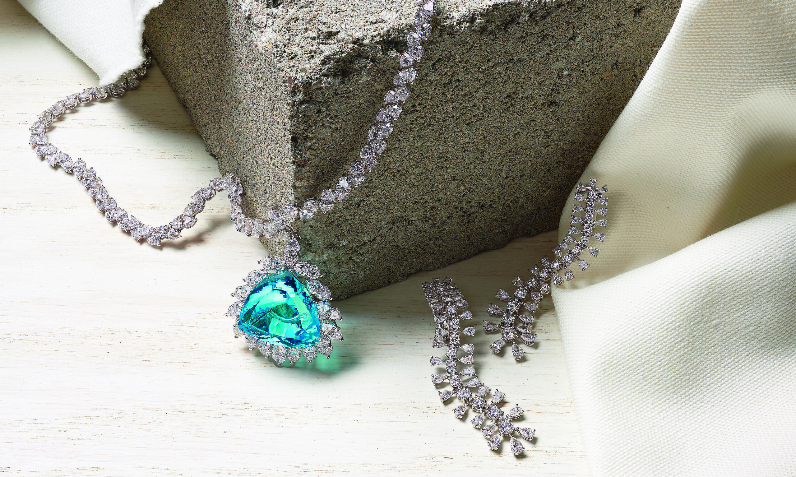 จากคอลเลกชัน Green Carpet ของ Chopard (chopard.com) ที่เน้นการใช้เพชรและอัญมณีที่มาจากแหล่งที่รับผิดชอบต่อสังคม อย่าง สร้อยคอที่ประดับด้วยทัวร์มาลีน Paraiba จากเหมือง Mavuco-Chalaua ในโมซัมบิก ประดับด้วยเพชรรูปหัวใจ น้ำหนัก 34.63 กะรัต และต่างหู รวมน้ำหนัก 8.21 กะรัต เพชรเหล่านี้ได้จากแหล่งจำหน่ายที่ได้รับรองโดย RJC (Responsible Jewellery Council) ตัวเรือนทั้งสร้อยคอและต่างหู ทำจากทองคำ Fairmined 18K