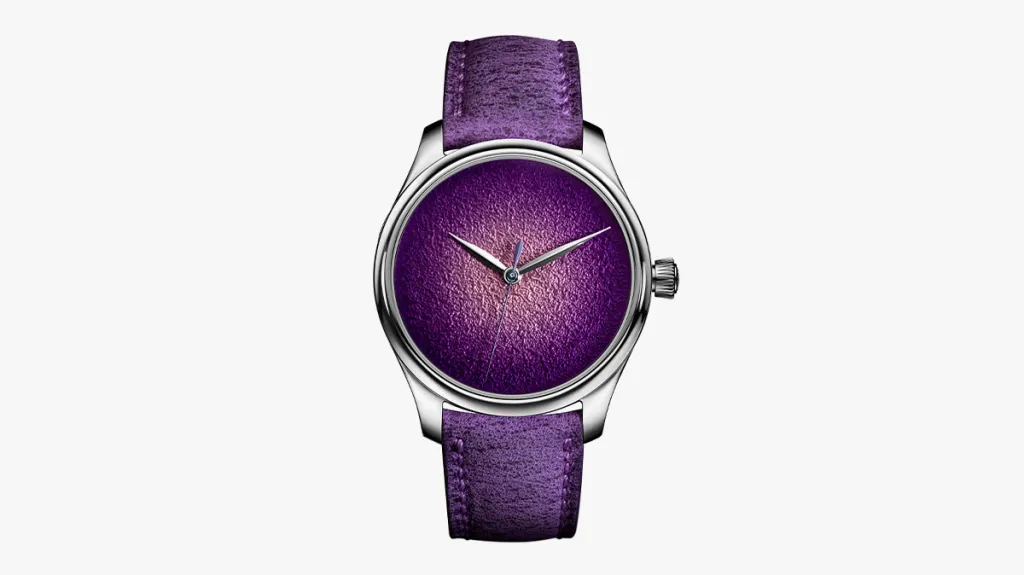 Within the Endeavour Centre Seconds Concept Purple Enamel’s pocket watch-inspired 40mm case is a breathtaking dial executed in the Grand Feu style. Consisting of a white gold base upon which a textured motif is engraved to give a hammered effect, its mesmerizing color is achieved by applying six enamel pigments in different hues and then firing the dial multiple times. The result, dubbed “Purple Haze" is nothing short of incredible, fading from a dark tone at the periphery to an electric color in the center and interrupted only by a set of leaf-shaped hands. Powered by the automatic caliber HMC 201 movement manufactured by Precision Engineering AG and paired to a handsome purple kudu leather strap, this is a watch for a discerning collector unafraid of just a touch of whimsy.