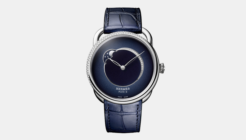 For the ladies, Hermès has just released a beautiful Arceau Petite Lune. This elegant timepiece comes with a moon phase indication on a blue lacquered dial and features an artistic representation of a lunar eclipse on both the dial and the top left part of the case. Crafted in stainless steel, this 38 mm timepiece is adorned with 114 diamonds and is topped with a rose-cut diamond in the crown. It is powered by the Maison’s H1837 self-winding movement and is fitted with an interchangeable blue alligator strap. Price uopn request.