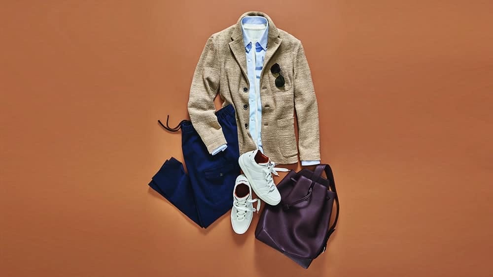 How to go unstructured while still looking sharp? A light, relaxed riff on the classic combo of blues and browns, anchored by luxurious white high-tops and a buttery-soft leather bag.