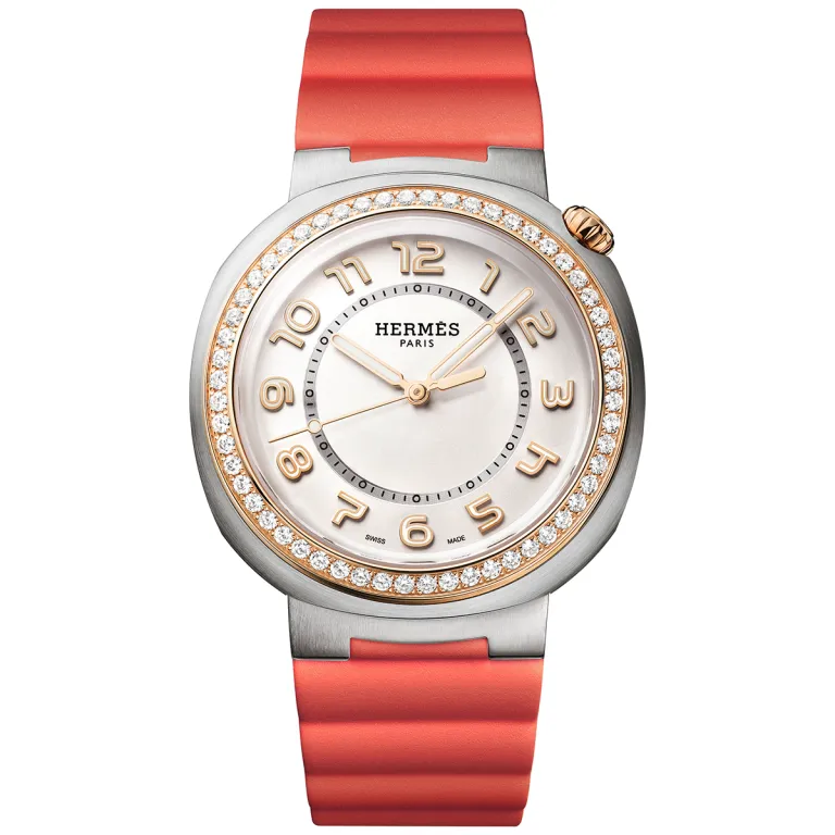 It’s not easy to design a dress watch since there is only so much you can do with the classic, minimalist three-hand formula without crossing over to another genre, like sports or high watchmaking. Hermès cracks the code with a round but also cushion shape that tweaks the dress watch aesthetic without violating it. It’s part fashion watch with a sporty vibe thanks to its rubber strap, which comes in eight colors, and part serious watchmaking, with the Hermès in-house H1912 movement. It comes in asteel or in a two-tone combination of steel and rose gold, with or without gem setting. $16,300 for the two-tone with diamonds model shown here.