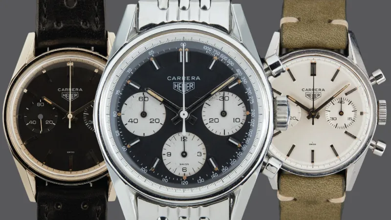 Jack Heuer, great-grandson of company founder Edouard Heuer, made perhaps his greatest contribution to the family business with the Carrera chronograph. Introduced in 1963, this simple, hand-wound tool watch—named, much like Porsche’s famous engine, for the notoriously dangerous Carrera Panamericana race in Mexico—featured a 36 mm case, a smooth bezel, a rehaut featuring a 1/5th-second scale, luminous sword hands, a mechanical movement from Valjoux, and a triple-register or dual-register chronograph layout. Available in silver, black, and “panda" and “reverse panda" designs, it was quickly adopted by numerous Formula 1 and other drivers in the mid-20th century. In the late 1960s, Heuer began powering automatic versions with its automatic Calibre 11 movement and its derivatives.