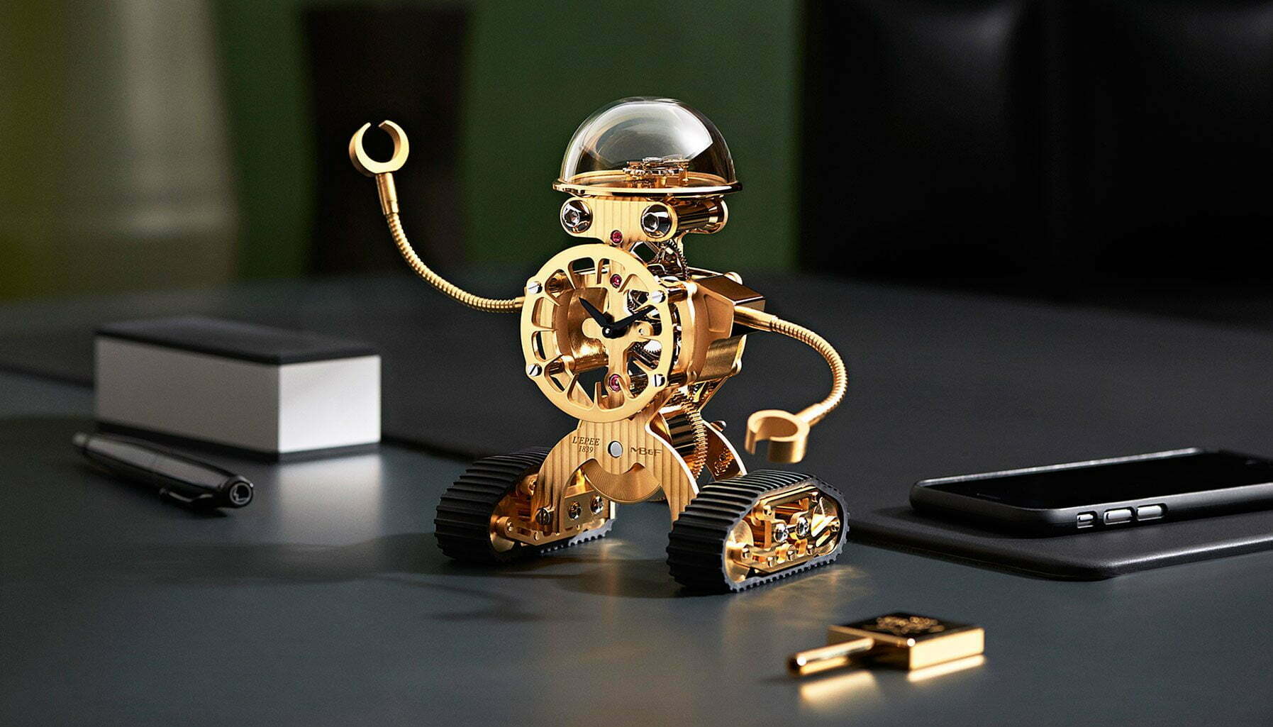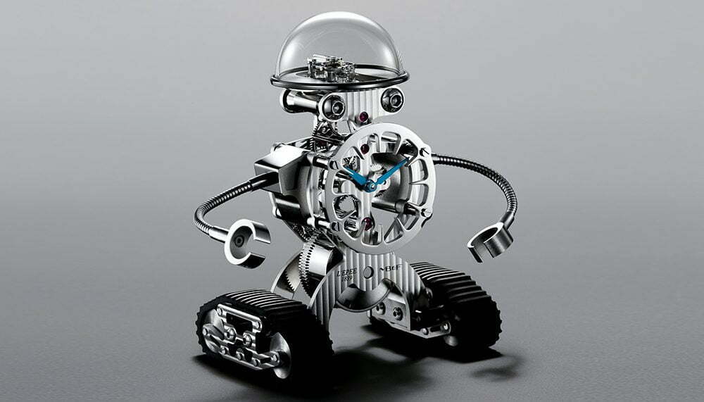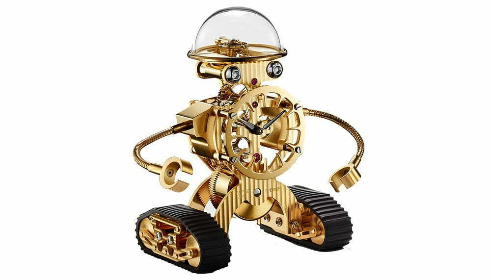 Debuting at SIHH 2016, Sherman isn’t the first robot-themed clock MB&F has produced. Melchior debuted last year, but while Melchior was imposing, Sherman is just cute. Produced in collaboration with clockmaker L’Epée, there are no fancy tricks to Sherman. His chest is the clock, with a ring of cutout hour marks cleverly forming his torso. Sherman’s ‘brain’ is actually a mineral glass dome, through which the balance wheel and regulation system is visible, while his ‘eye sockets’ actually contain the winding mechanism. His arms are fully articulated and, in homage to the Sherman tank, his feet are tank tire treads.