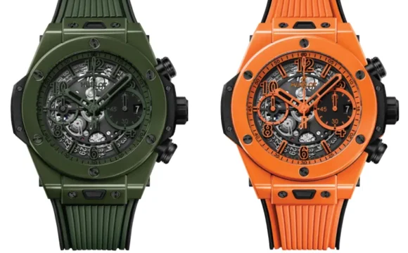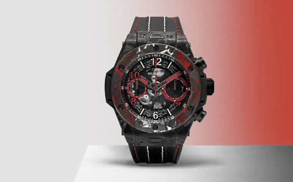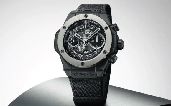 ทูร์บิยองฟูลคาร์บอนแบบบูรณาการ Hublot Big Bang ขนาด 43 มม. ผสมผสานคาร์บอนไฟเบอร์ที่มีน้ำหนักเบาและทนทาน เช่นเดียวกับวัสดุการออกแบบที่มีสไตล์ เรียกว่า texalium ซึ่งเป็นผ้าที่ทำจากไฟเบอร์กลาส มีพื้นผิวที่เป็นกรรมสิทธิ์และมีการเคลือบอะลูมิเนียมบางๆ บนพื้นผิว ในราคา 127,000 ดอลลาร์