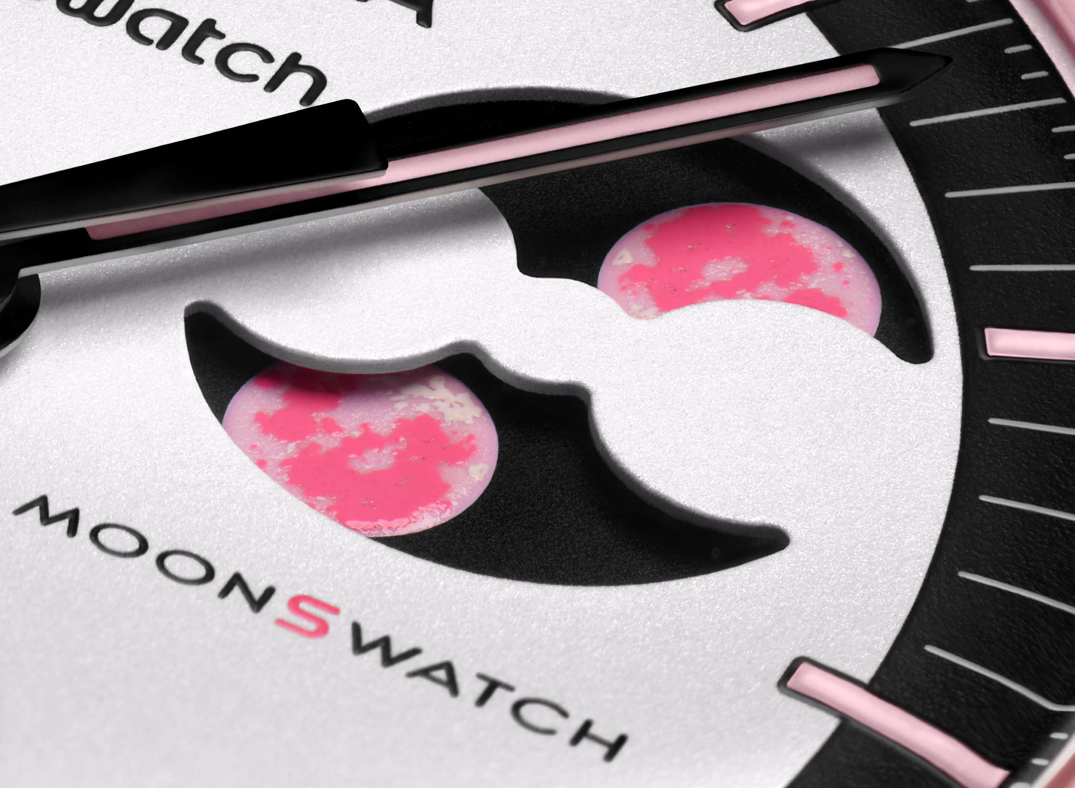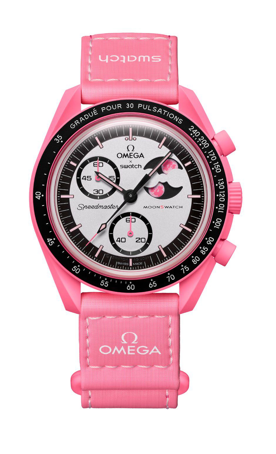 Like all models in the Bioceramic MoonSwatch Collection, MISSION TO THE PINK MOONPHASE is crafted from Bioceramic, Swatch’s innovative, patented mix of two-thirds ceramic and one-third biosourced materials produced from castor oil. It also boasts many of the iconic features of OMEGA’s legendary Speedmaster Moonwatch, including its asymmetrical case and distinctive, recessed Speedmaster subdials.