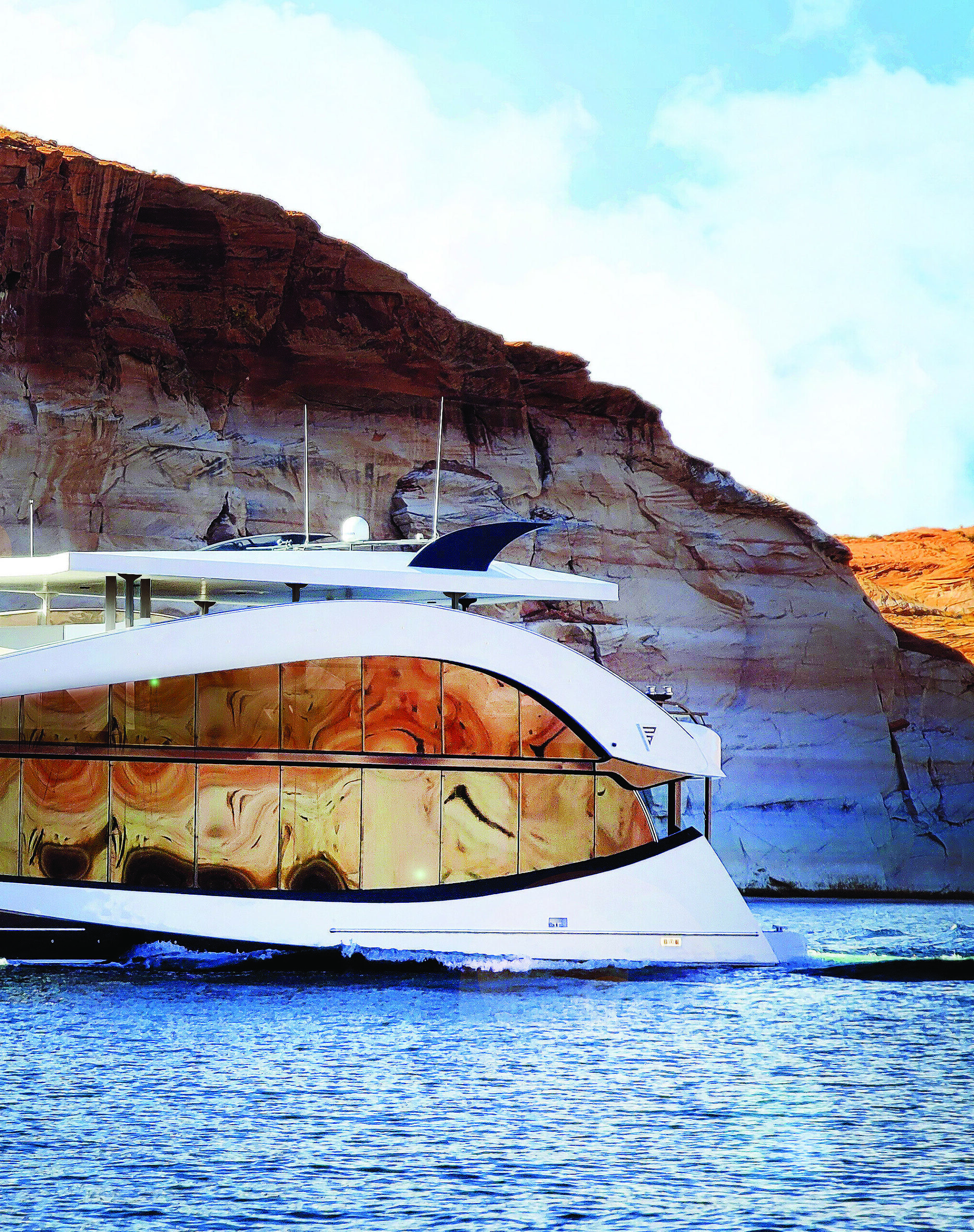 The term “freshwater yacht" was an oxymoron until J. David Weiss designed Invictus, a futuristic 80-footer that redefines large houseboats. Having penned dozens of oceangoing superyachts for Europe’s leading builders, Weiss was given carte blanche by Arizonabased Bravada Yachts to create a new freshwater category. “The designs have typically been boxy, bloated RVs," he says. “The good news is their scale can provide a custom yacht experience."