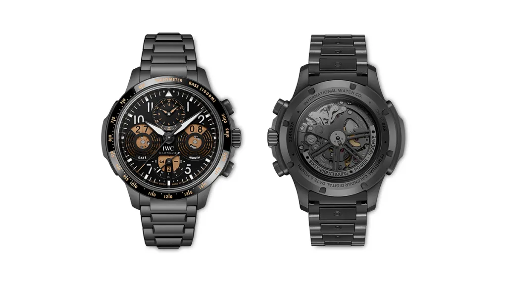 The name may not roll off the tongue, but when a wristwatch has this many technically impressive functions tucked inside a handsome package, we’re not going to quibble. Not only does the complicated Ceratanium model feature a chronograph, it’s also equipped with a perpetual calendar—and not just any perpetual calendar, but a crown-operated digital version that displays the date and the month on large golden discs at 9 o’clock and 3 o’clock, a throwback to IWC’s 1880s heyday, when the company produced Pallweber pocket watches that displayed the hours and minutes in a digital format using single digits.
