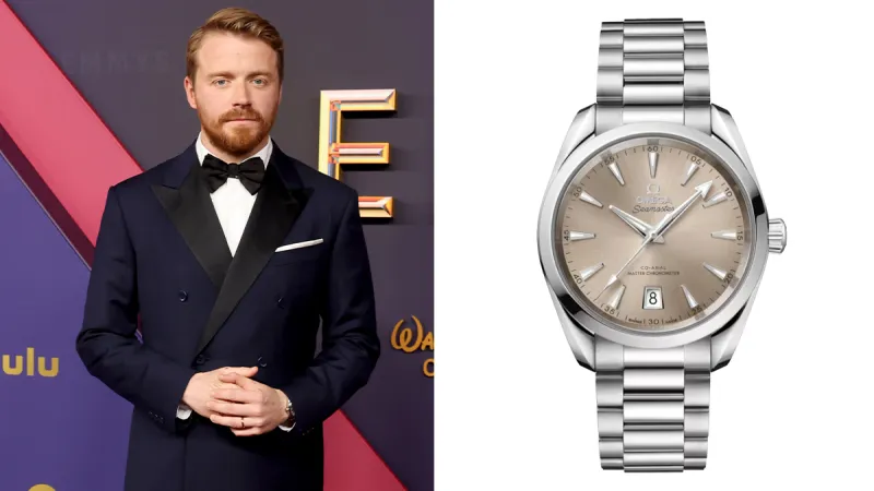 Jack Lowden, nominated for his performance in Slow Horses, looked as sharp as a secret agent, sporting custom Louis Vuitton and an Omega Seamaster Aqua Terra Shades. Priced at $6,600, the timepiece features a 34 mm stainless steel case, a brass dial with a sandstone, sun-brushed finish, and a steel bracelet.