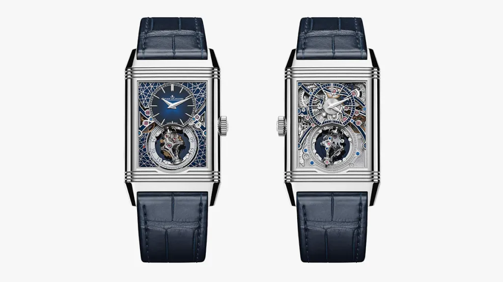 Said gravity-compensation device spins upon two axes: While an inner cage rotates through 360 degrees every 16 seconds, an outer cage spins in the opposite direction once every 60 seconds, forming a small seconds indicator at the bottom of the dial. On one side of the watch, the main timekeeping dial is executed in a deep blue lacquer and surrounded by a lattice of white gold lines intersecting blue lacquer plates and bridges; on the reverse, significant skeletonization allows the wearer to view the Calibre 179’s intricate clockwork beneath. Achieved through tens of hours of painstaking handcraft, the Reverso Hybris Artistica Calibre 179 is a testament to Jaeger-LeCoultre’s enduring mastery of high watchmaking.