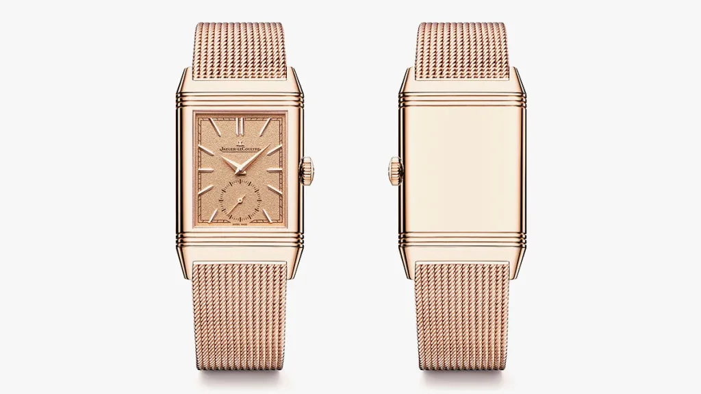 One can scarcely do better than a simple Reverso Monoface when searching for an ideal dress or everyday watch. But if a slightly more elevated look is your preference, then you should consider the new Reverso Tribute Monoface Small Seconds. Housed in a 27.4mm x 45.6mm pink gold case and fitted to a matching pink gold Milanese bracelet, this spectacular execution of one of the world’s most iconic timepieces elevates the Reverso to a piece of wearable art. Featuring a finely grained golden-tone dial with faceted hour indices, small seconds, and a dauphine handset, it has a blank caseback that can easily be engraved with a message or design of your choice.