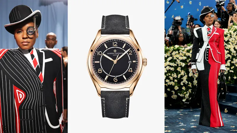 It seemed like everyone was in Thom Browne at the Met Gala, but Janelle Monae has long been a fan of the designer, often wearing his elaborate ensembles on the red carpet. This time she paired one of his tailored suit skirt looks complete with a bowler hat with a monocole featuring a watch dial and a time- and date-only Vacheron Constantin Fifty Six. It ticked all the right boxes: dandy, costume, and fashion-forward.